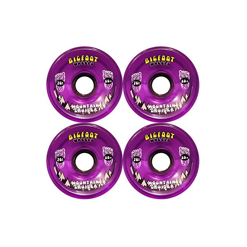 These Bigfoot Mountain Cruisers offer a newly modified translucent super high rebound formula. The latest innovations offer a super high rebound 80a durometer urethane and a slightly offset hub. Coming in at 76mm in diameter, 80a in hardness, and 53mm in width. Slightly offset hub with a 47.5mm contact patch, rounded slightly inner edge. All of these details put together equal a wheel with quick acceleration, smooth ride, good grip, with good slide characteristics (after the break-in period). The rounded edges allow the wheel to break loose and slide easily. This wheel is designed mainly for freeriding and cruising.