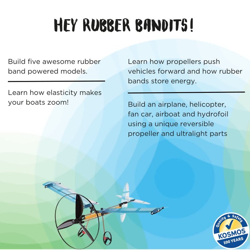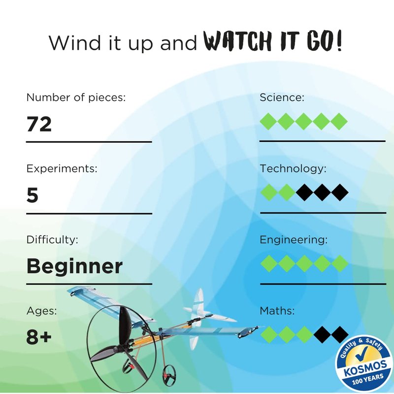 - Driven by an awesome rubber band powered propeller.