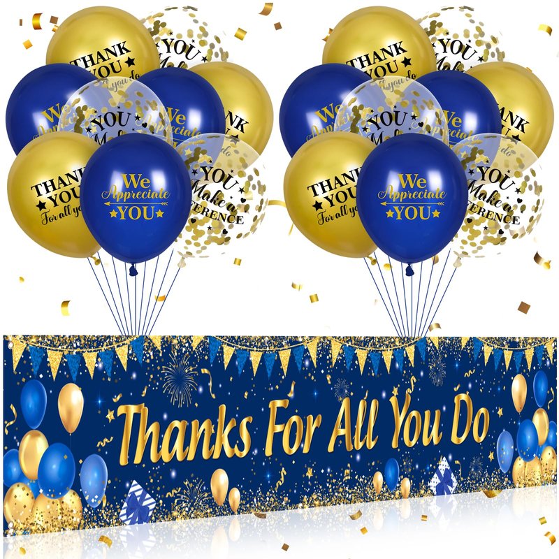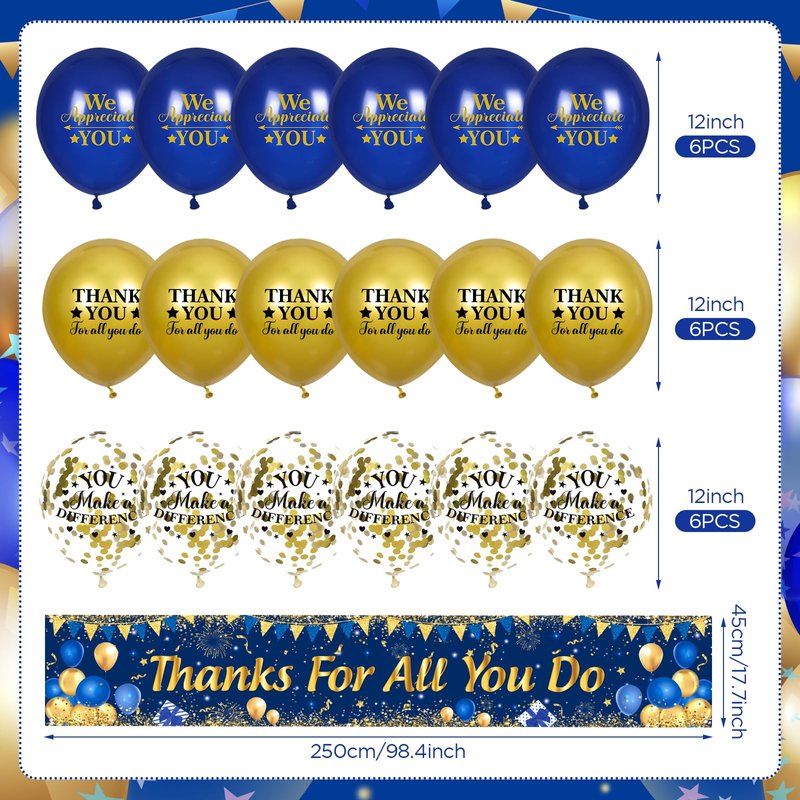 - 🎊Complete Thank You Set: This pack includes 1 large blue gold Thanks for All You Do banner measuring 98 x 18 inches and comes with 18pcs 12inch latex balloons with thank you patterns. Elevate your gratitude with our we appreciate you banner set