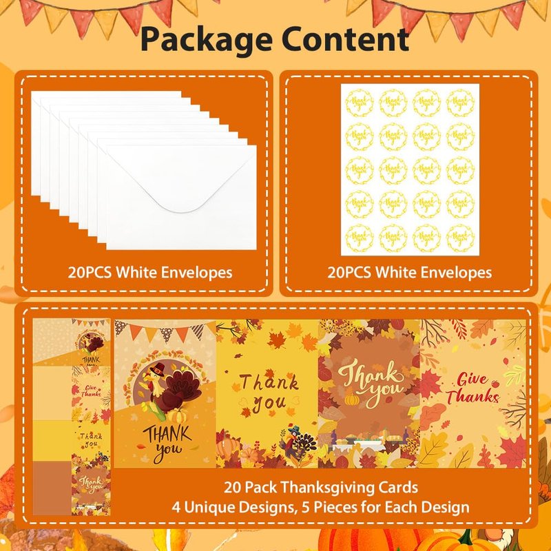 Package includes: 20 x thanksgiving cards(5 cards each of 4 designs), 20 x white envelopes, 1 sheet round sticker(total 20pcs stickers)
