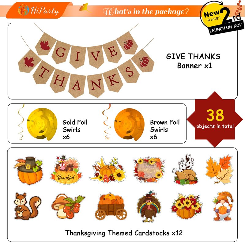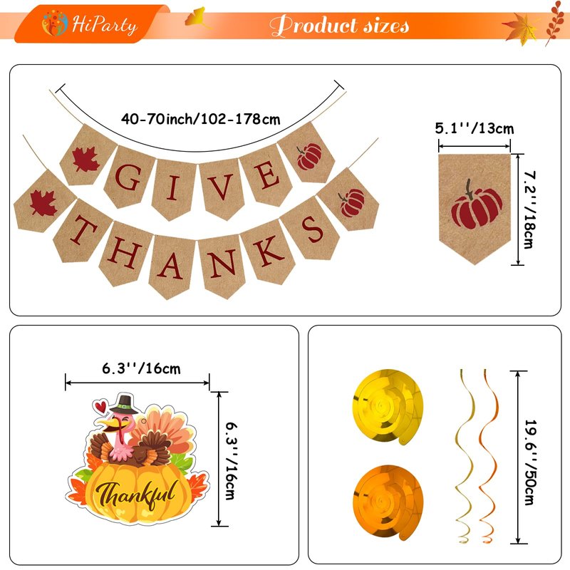 - 🌽【Give Thanks Banners】This thanksgiving banner set includes 14pcs "GIVE THANKS" and maple leave and pumkpins cutout with 12pcs hanging swirls in orange and gold, and 12pcs cutout like gnome、turkey、pumpkin、maple leave、squirrel、chestnut and so on,decorating the Thanksgiving atmosphere! 38pcs in total.The glue pins and ribbon are also included for your quick use!