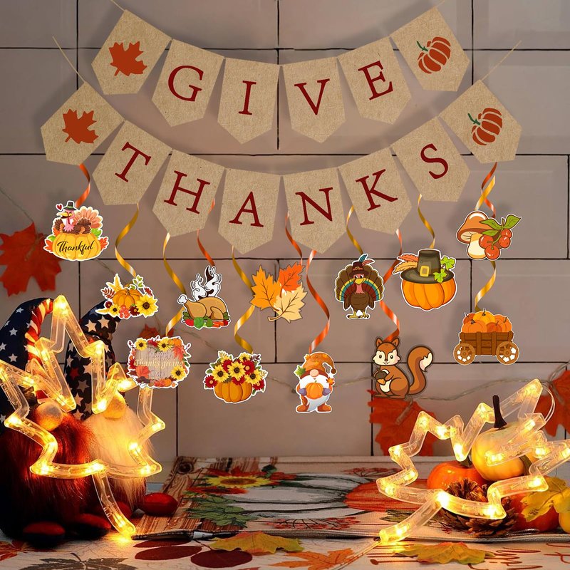 Thanksgiving Decorations, Give Thanks Banner, Thanksgiving Banner Party Decorations with 12pcs Hanging Swirls, Fall Banner with Turkey Decorations for Home Outdoor Indoor Office Classroom, Fall
