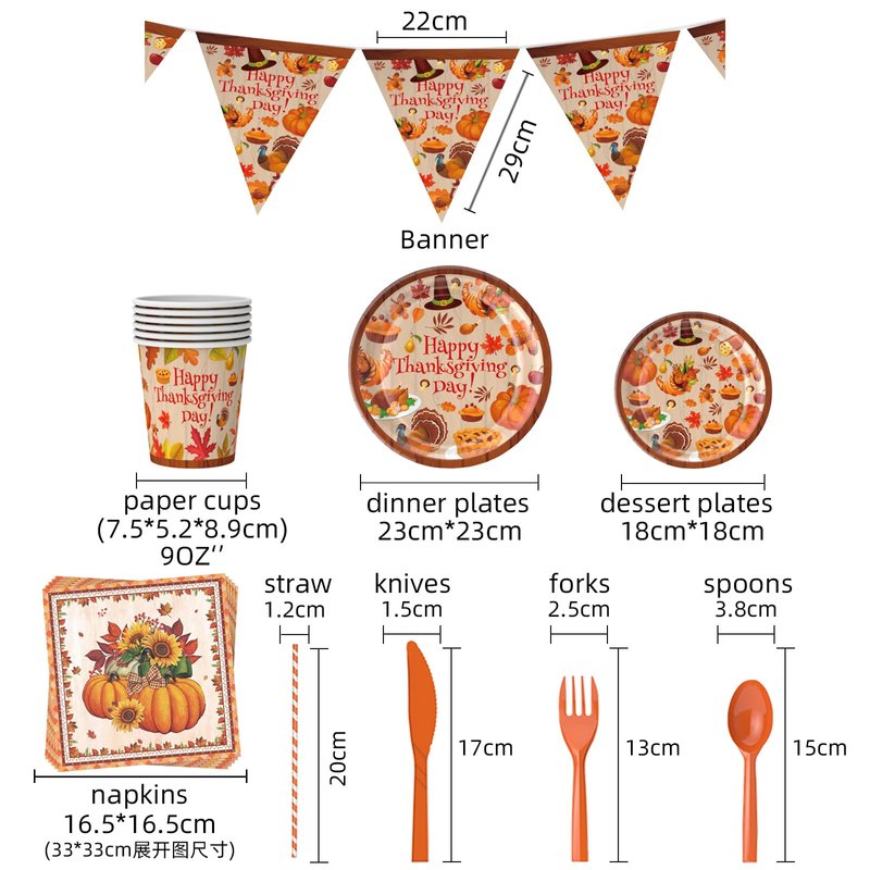 - 81PCS Tableware Set: 10pcs 9-inch dining plates, 10pcs 7-inch dessert plates, 10pcs 6.6-inch napkins, 10pcs 9-ounce paper cups, 30pcs sets of orange plastic knives+spoons+forks, and HAPPY THANKSGIVING banner, sufficient and rich to meet your party and daily needs, and enjoy unforgettable Thanksgiving party time with friends!