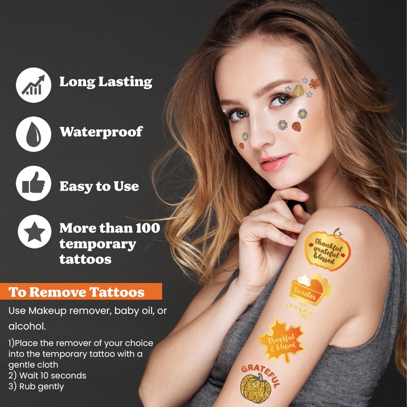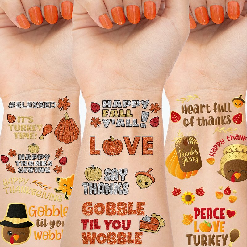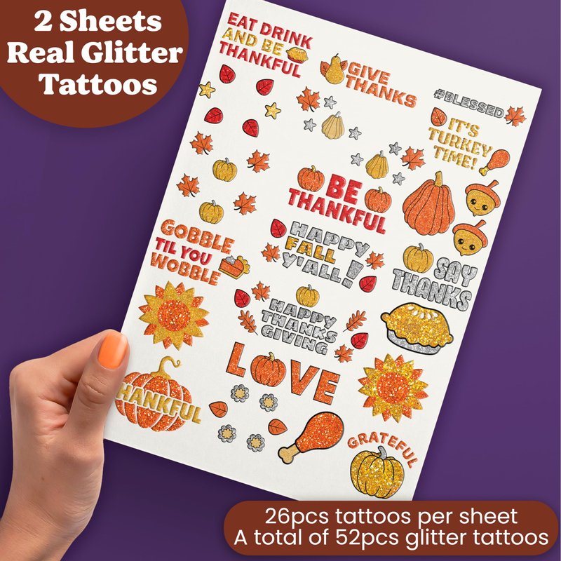 - π Take Thanksgiving to the next level! Celebrate with this set of unique glitter and metallic tattoos. These sheets feature hand-drawn designs by our illustrators that are sure to add a pop of sparkle to your holiday makeup and outfit. Featuring real glitter and unique designs, these fall temporary tattoos are perfect for creating cool thanksgiving looks or as a gift for friends and family.
