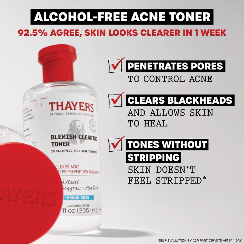 - Alcohol-Free Blemish Toner For Face: Thayers Alcohol-Free and Fragrance-Free Blemish Acne Toner clears acne blemishes, blackheads and whiteheads, while actively preventing new breakouts all without wrecking your skin's moisture barrier