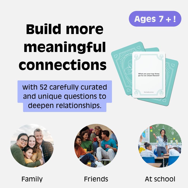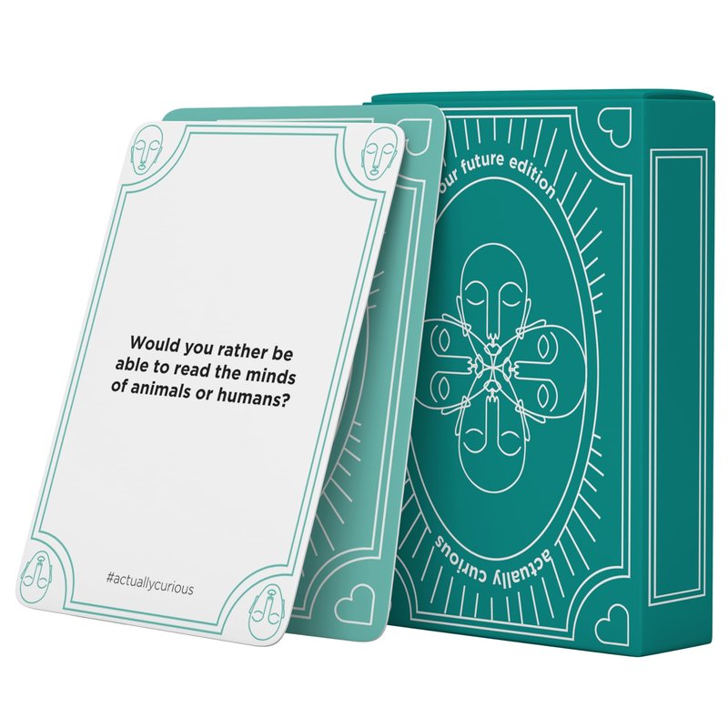 Introducing the Actually Curious Our Future Edition: Your Gateway to Empathy and Connection Experience the acclaimed social and emotional learning conversation game that's making waves! The Our Future Edition is here to inspire friendships, self-discovery, boundless imagination, and an insatiable curiosity. As seen in some of the world's most prestigious publications and platforms, including The New York Times, NBC Today, ABC GMA, Refinery 29, Cosmopolitan, Goop, Oprah, Forbes, Refinery29, Men’s Health, and Women’s Health. Ideal for families, classrooms, kids aged 7 and up, teens, and anyone seeking a dose of inner child fun. Read a question and listen, truly listen, without judgment, to everyone's answer. Award the card and one point to the answer that touches your heart. Our 26 mint-colored and 26 teal-colored cards are not just conversation starters; they're a statement of our commitment. Produced with ethical labor, sourced from sustainable paper suppliers, and packaged in a pocket-sized box that fits seamlessly into any bag. Perfect for school, playdates, road trips, classrooms, or therapy offices. Use the Our Future Edition as a tool for mindfulness and social and emotional learning. Our thoughtfully crafted questions promote self-discovery, critical thinking, diversity appreciation, and healthy coping mechanisms through engaging discussions and personal journaling. Actually Curious is more than a game; it's a movement. We use the science and psychology of emotional connection to bring people closer together, teach vital empathy skills, and nurture inclusivity and well-being. CNN has hailed our game, stating, "The travel game helps players explore their dreams and ambitions while gaining a better understanding of those around them." Join the movement, spread empathy, and embark on a journey of self-discovery and connection with Actually Curious - Our Future Edition. Start playing, start connecting! Elevate your classroom mindfulness with our Mindfulness Cards Family Edition! Perfect for mindfulness activities for kids, these mindful minutes are designed to create a calm and focused atmosphere in the classroom. Teacher-approved and kid-adored, our Mindfulness Card Games for Kids foster emotional well-being and are ideal stocking stuffers. Use them as teacher materials, classroom ice breakers, or for road trips to keep the learning journey engaging. Rethink your approach to mindful therapy games with our Mindfulness Therapy Card Game. It's not just a game; it's a toolkit for educators, parents, and counselors to promote mindful conversation starters and self-discovery. Explore the power of mindful games for adults and children alike. Our game activity cards are more than educational stuff; they're a bridge to connect, understand, and build empathy. Incorporate mindful practices into your educational toolkit with our Mindfulness Activity Card. It's more than a prompt; it's an essential resource for teachers, parents, and anyone fostering a growth mindset. From group activities to individual self-reflection, our Mindfulness Game Cards Kids Edition is a versatile tool for therapists, parents, and educators. Use them in the classroom, at home, or during counseling sessions to explore emotions and foster connection. Unleash the power of conversation with our Rethink Mindful Conversation Starters. Perfect for group discussions, classroom discussions, or even dinnertime, these cards are an essential tool for promoting positive behavior development. Join the movement to promote mindfulness in schools and beyond. Our Mindfulness Cards Family Edition is more than a game; it's a therapeutic challenge, an anxiety relief tool, and a resource for building empathy. Let's foster connection and growth together!