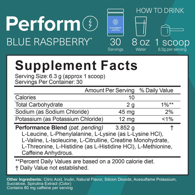 - Unlock your peak potential with Perform: Amino Co. blend fuels muscle growth, recovery, focus, and concentration. Smart, with just 60mg of caffeine per serving.