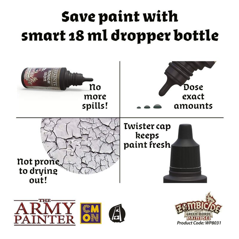 - CAREFULLY CHOSEN EXPANSION – Includes 6 colours specifically selected for CMON and Guillotine Games’ Zombicide: Green Horde. Works great in compliment to the Black Plague Paint Set or if you need to paint hordes og orcs, goblins and other greenskins in any setting whether it being Warhammer 40,000, Age of Sigmar, Dungeons and Dragons