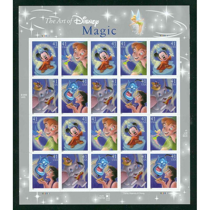 The Art of Disney: Magic, Full Sheet of 20 x 41-Cent Postage Stamps, USA 2007, Scott 4192-95
