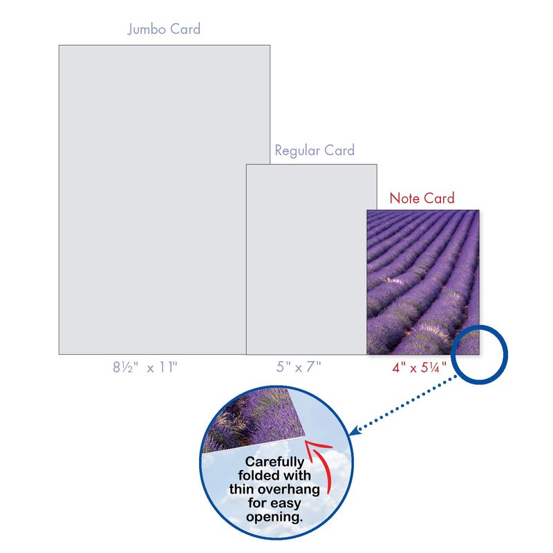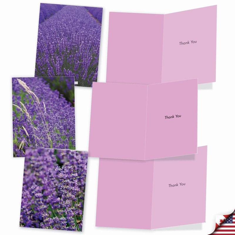 FIELDS OF LAVENDER THANK YOU CARD SET Breathtaking views of blooming lavender fields will touch the hearts of your family and friends and make your message stand out. The unique designs appeal to all varieties of people and tastes. Small in size but large in impact, these unique US-made cards are a classy way to show someone you care. PREMIUM QUALITY AND DESIGN These small cards were created as an assorted stationery This is part of a larger collection that spans a broad range of motifs, from traditional themes to contemporary graphics to vintage art – there's something for everyone! Our cards are printed on-demand on thick, bright, premium recycled paper. Many of the designs are available in both greeted and blank versions. Known for our funny cards and what has been described at times as snarky humor. We proudly print all our products in North America - USA and Canada (of all places)! Every card is printed-to-order and on demand, which eliminates waste and obsolete inventory. No matter what the product is, we strive for perfection - every card, every order, every time.
