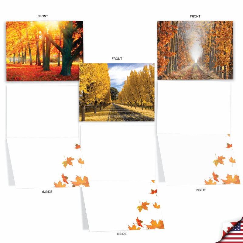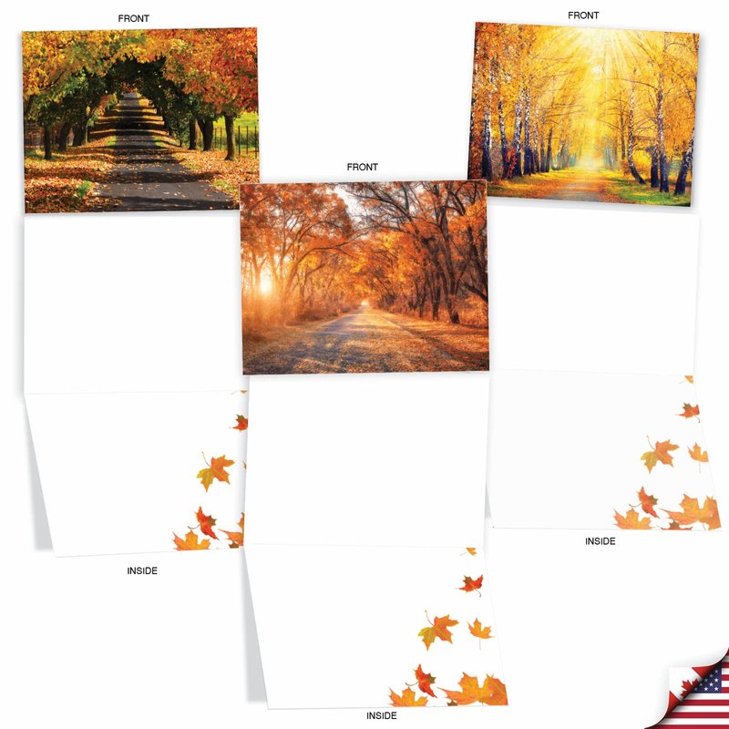BEAUTIFUL AUTUMN NOTE CARD SETIf you're looking for beautiful cards that are perfect for all occasions, then these blank greeting cards featuring autumn leaves are for you. With photographs of sunlight filtering through yellow and orange leaves, these cards will leave an impression. We make our cards with care in the US. You can confidently use give them as gifts or use them for any occasion. PREMIUM QUALITY AND DESIGNThese small cards are an assorted stationery note set. This is part of a larger collection that spans a broad range of motifs, from traditional themes to contemporary graphics to vintage art – there's something for everyone! Our cards are printed on-demand on thick, bright, premium recycled paper. Many of the designs are available in both greeted and blank versions. Known for our funny cards and what has been described at times as snarky humor. We proudly print all our products in North America - USA and Canada (of all places)! Every card is printed to-order and on demand, eliminating waste & obsolete inventory. No matter what the product assortment is, we strive for perfection - every card, every order, every time.