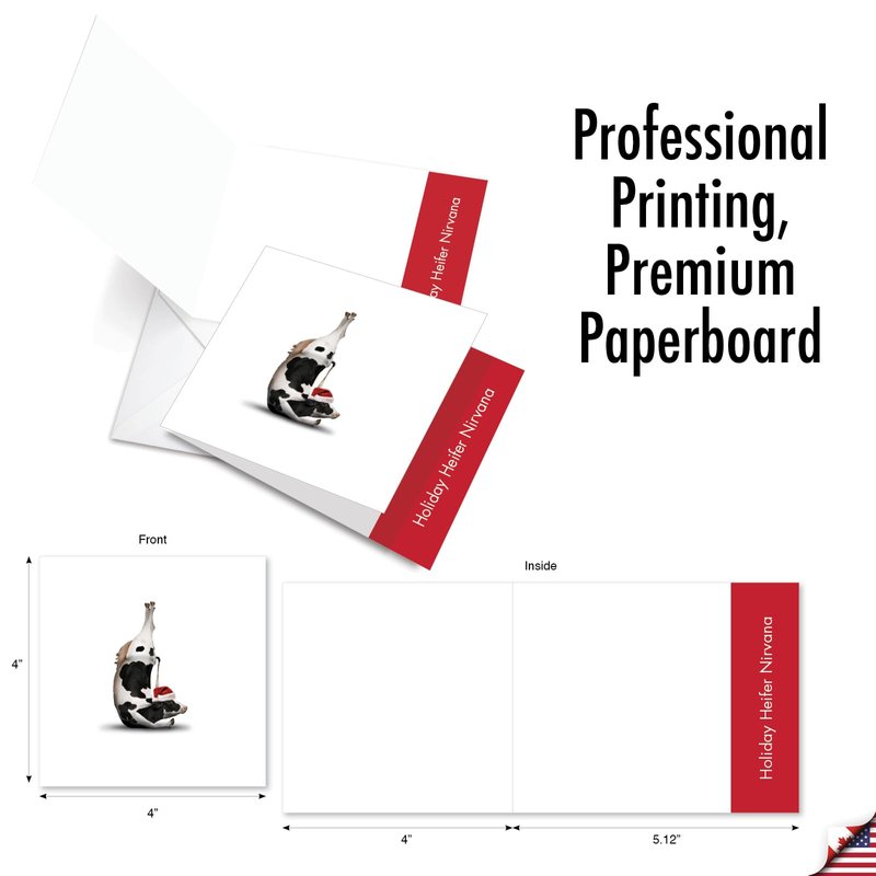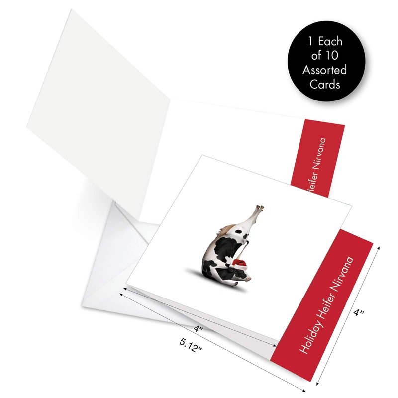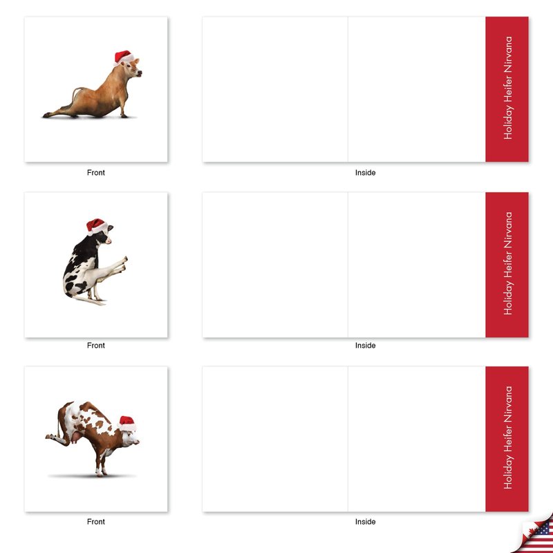 Want a different approach with your X-mas greeting cards this holiday season? Why not share your love of Yoga and farm animals put together in one hilarious package. Our funny cow cover doing advanced yoga might be the one you need. This funny themed card is just ridiculously out there, unique and totally unexpected your family and friends will be shocked with delight once they open your present. The white background of the card further giving highlight to that humorous image at front. The Santa hat is just the right touch of humor that completes this joke. Go ahead and order your 10-piece pack now. Don't forget to write down your personalized heartfelt greeting inside and may we all have a wonderful Yuletide period. Our good as gold cards are printed on thick, snow white cardstock. All happy holiday notecards are made of recycled material (not papyrus, naturally). Our print on demand technology further reduces paper waste and environmental impact. The high gloss cover photo pops with quality and color, while the inside is matte, creating a smooth writing surface for your heartfelt, joyful Christmas notes. This Christmas season, reach friends, family, and coworkers living near or far, as every greeting card ships with a mailing envelope. Bulk notecard assortments and sets arrive in a reusable box. All boxed notecard sets are easily stored in a work office desk, ready to customize for your next life occasion. Some card designs and photos even look great framed, creating appealing wall art for your home. This year, leave a big impression on your recipient, no matter the occasion. There are beautiful designs, and funny greetings, waiting for you!