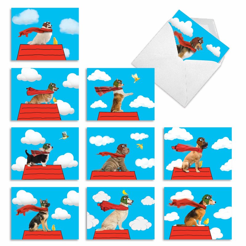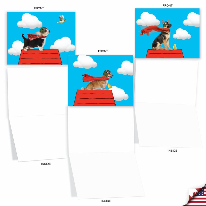 Here is fun and cool notecard set that features an assortment of superhero dogs ready to save the day! Save your friends and family from gloomy celebrations with this hip and trendy cardstock. 10 awesome cards each featuring a mighty pup standing proud and tall! Nothing makes celebrations better than humorous gifts. Order this sweet card collection and use it to wish everyone today! Celebrate birthdays, anniversaries, and a lot more with this unique card bundle. This special card set comes in 10 allowing you to wish 10 lucky recipients on their special day. You can also use this as a letter card for expressing thoughts and sentiments that you couldn't say in person! Make it a greeting to remember with handwritten messages! Our good as gold cards are printed on thick, snow white cardstock. All of our all-occasion note cards are made of recycled material (not papyrus, naturally). Our print on demand technology further reduces paper waste and environmental impact. The high gloss cover photo pops with quality and color, while the inside is matte, creating a smooth writing surface for your heartfelt notes. This year, reach friends, family, and business coworkers living near or far, as every greeting card ships with a mailing envelope. Bulk notecard assortments and sets arrive in a reusable box. All assorted cards for kids and parents are easily stored in an office desk, ready to customize for your next life occasion. This year, leave a big impression on your recipients. These all occasion cards are great for birthday gifts, thank yous, and hello cards. There are beautiful designs, and funny greetings, waiting for you!