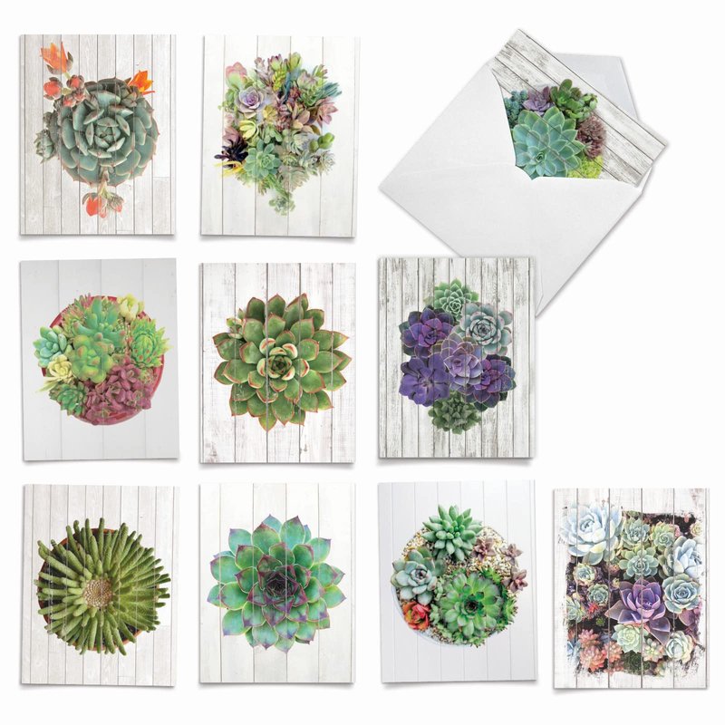 Here is a unique and beautiful greeting card set that features an assortment of succulent designs. 10 premium greeting cards each featuring a colorful succulent print set against a vintage wooden background. Each card features a different succulent and can be used for virtually any occasion. This card set is great for people who love sending out cards to everyone. It's ungreeted on this inside making it great for different occasions. Use it for celebrating anniversaries, baby showers and a lot more. You can't go wrong with a boxed card set this beautiful. It's also great to have more than enough cards on hand. Especially in these times where we need to express love and sincerity from afar. Grab your own premium card set today! Our good as gold cards are printed on thick, snow white cardstock. All of our all-occasion note cards are made of recycled material (not papyrus, naturally). Our print on demand technology further reduces paper waste and environmental impact. The high gloss cover photo pops with quality and color, while the inside is matte, creating a smooth writing surface for your heartfelt notes. This year, reach friends, family, and business coworkers living near or far, as every greeting card ships with a mailing envelope. Bulk notecard assortments and sets arrive in a reusable box. All assorted cards for kids and parents are easily stored in an office desk, ready to customize for your next life occasion. This year, leave a big impression on your recipients. These all occasion cards are great for birthday gifts, thank yous, and hello cards. There are beautiful designs, and funny greetings, waiting for you!