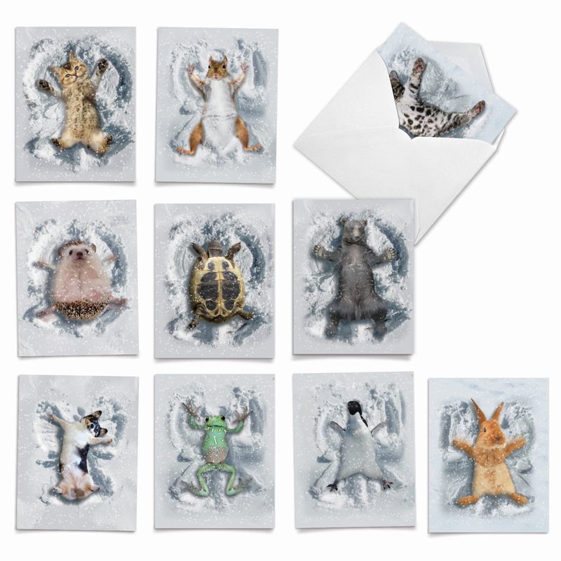 The Best Card Company 10 Blank Notecards w/Envelopes Box Set, 4 x 5.12 Inch, Wildlife Cards for Men Women and Kids - Critter Snow Angels M4187OCB-B1x10