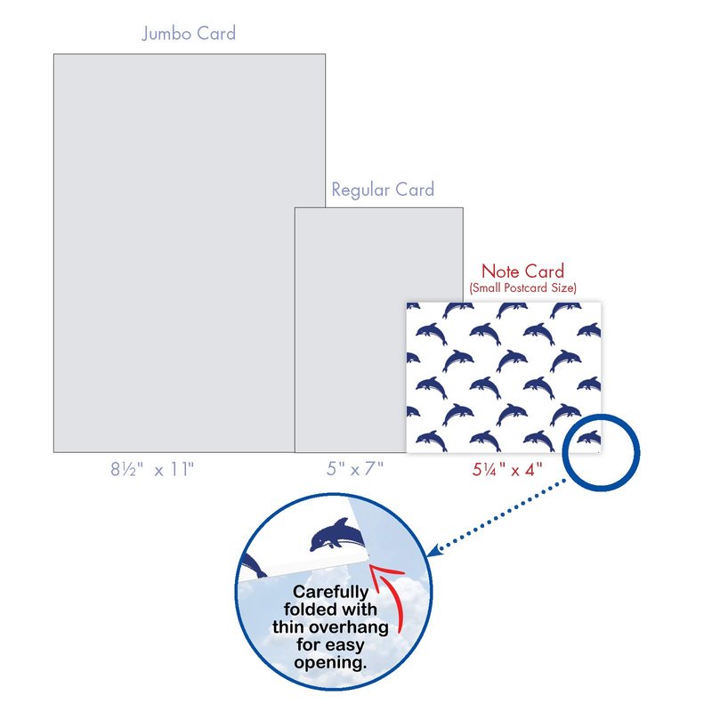 NAVY ‘OCEANO-GRAPHIX' THEMED THANK YOU CARDS Ahoy there! Mini in size, these cards deliver an ocean-sized impact! Our cards are high quality and created in the USA by professional artists. These navy and white cards feature a variety of ocean-themed patterns. Say "thank you" with cute whales and starfish. "Sea" these darling sailor cards for yourself today, matties! PREMIUM QUALITY AND DESIGN These small cards were created as an assorted stationery This is part of a larger collection that spans a broad range of motifs, from traditional themes to contemporary graphics to vintage art – there's something for everyone! Our cards are printed on-demand on thick, bright, premium recycled paper. Many of the designs are available in both greeted and blank versions. Known for our funny cards and what has been described at times as snarky humor. We proudly print all our products in North America - USA and Canada (of all places)! Every card is printed-to-order and on demand, which eliminates waste and obsolete inventory. No matter what the product is, we strive for perfection - every card, every order, every time.