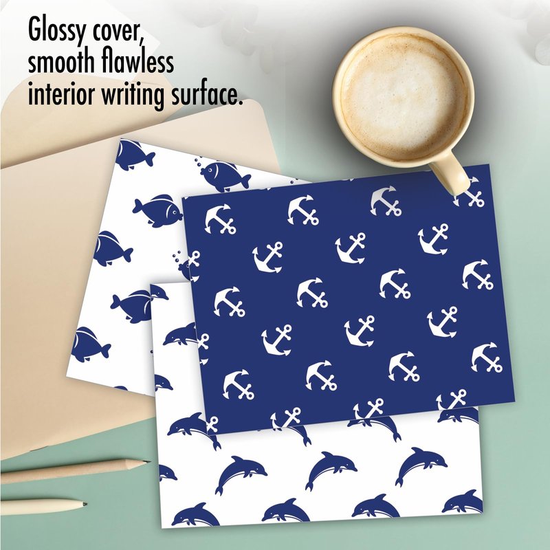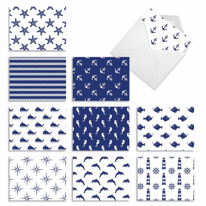 - MINI GREETING CARD SET - 4 x 5.12 Inch cards. Comes with 10 thank you cards and white envelopes. These cards showcase navy and white ocean-themed patterns. You’ll have plenty of writing room for personal sentiments. We offer a wide selection of designs and art styles, offering a unique match for men and women looking for the right note card for their special, personal message.