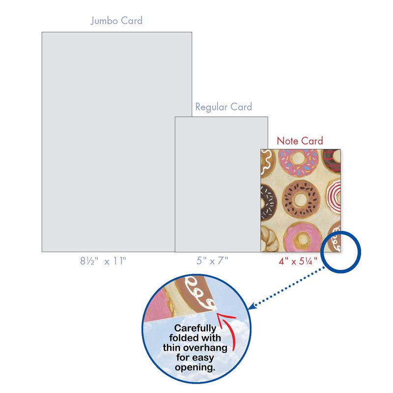 We offer a huge 8.5 x 11-inch jumbo size version of most of our designs and assortment packs of our most popular designs in just about any occasion and configuration. We also publish blank versions of many designs and assortments to be used as thank you notes, friendship, miss you, thinking of you or any other purpose or occasion you can think of.
