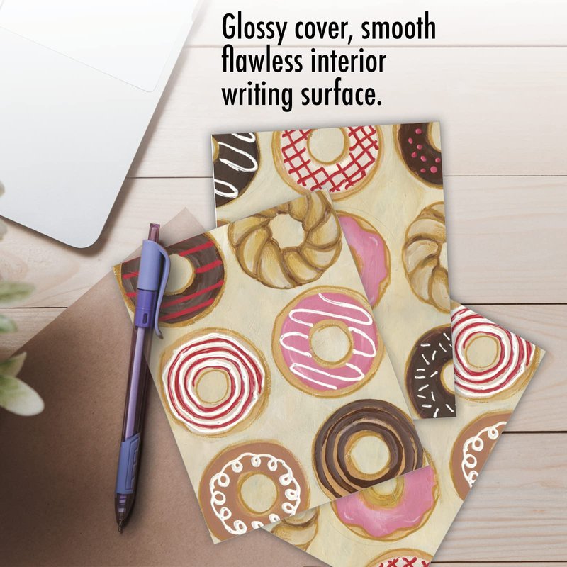 - INSIDE GREETING: The inside is ungreeted, making this perfect for your customized thinking of you, miss you, just because notes, for any time and for all occasions! COVER - Featuring Images Of Tasty-Looking Doughnuts