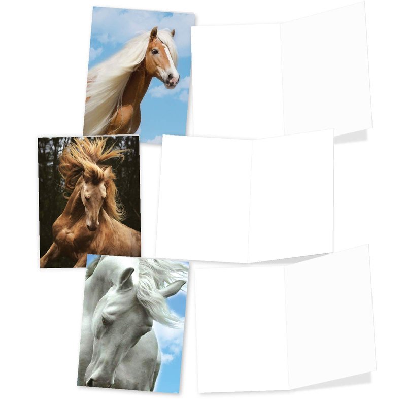 - INSIDE GREETING: The inside is ungreeted, making this perfect for your customized notes for all occasions! COVER: Mares, stallions, steeds, pintos, bays and chestnuts painted in active and posed positions.