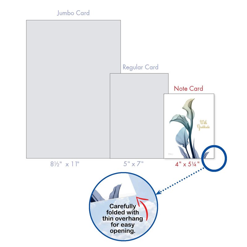 We offer a huge 8.5 x 11-inch jumbo size version of most of our designs and assortment packs of our most popular designs in just about any occasion and configuration. We also publish blank versions of many designs and assortments to be used as thank you notes, friendship, miss you, thinking of you or any other purpose or occasion you can think of.