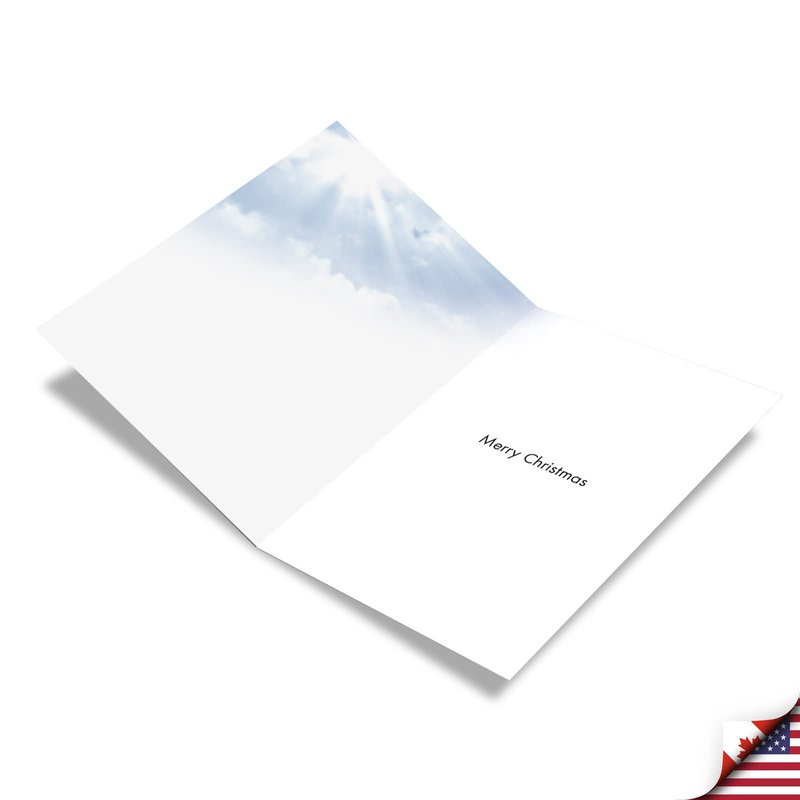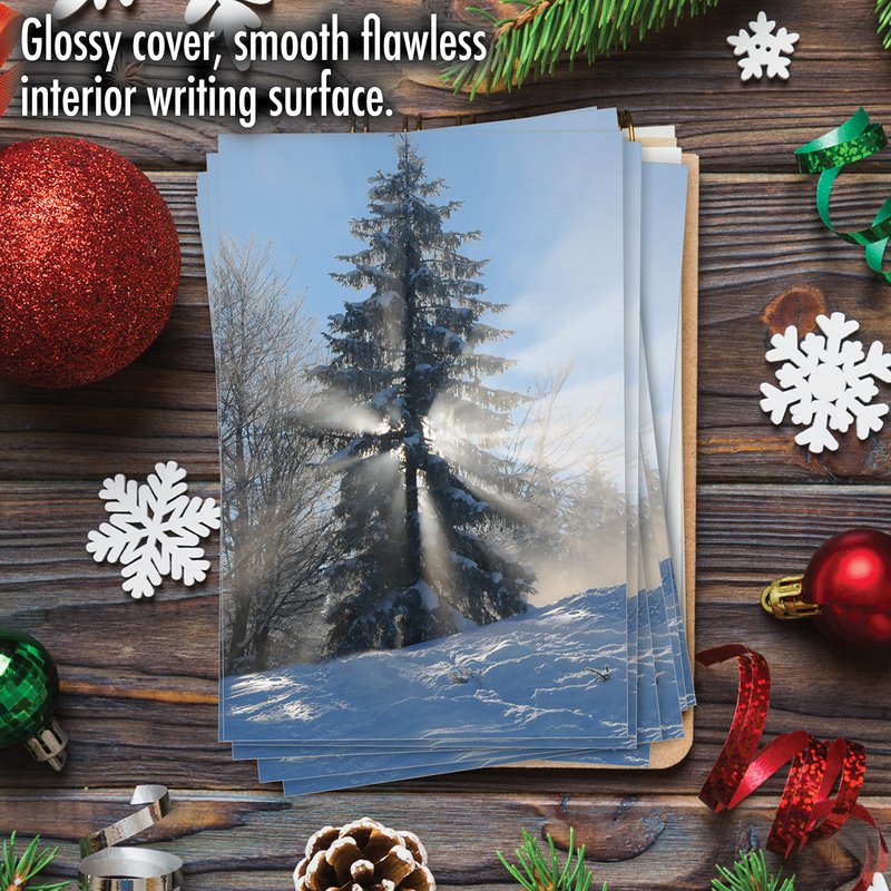 Spread the peaceful, Christmas spirit to everyone you love and care for with this lovely, nature-themed notecard. An elegant card featuring snow covered pine trees with morning sunshine rays hitting its beautiful leaves. A picture-perfect winter landscape that will surely bring some peace to your receivers. This is a nice card to read on Christmas morning. A sweet and sentimental gift that will surely make any reader smile. Your recipients will truly feel special and remembered when they read this. Thanks to this 12-card bundle, you can now gift it to 12 of your close friends and distant relatives. Share the wonderful winter scenery to all your tropical dwelling loved ones on Christmas day! Our good as gold cards are printed on thick, snow white cardstock. All happy holiday notecards are made of recycled material (no papyrus, naturally). Our print on demand technology further reduces paper waste and environmental impact. The high gloss cover photo pops with quality and color, while the inside is matte, creating a smooth writing surface for your heartfelt, joyful Christmas notes. This Christmas season, reach friends, family, and coworkers living near or far, as every greeting card ships with a mailing envelope. Bulk notecard assortments and sets arrive in a reusable box. All boxed notecard sets are easily stored in a work office desk, ready to customize for your next life occasion. Some card designs and photos even look great framed, creating appealing wall art for your home. This year, leave a big impression on your recipient, no matter the occasion. There are beautiful designs, and funny greetings, waiting for you! Many family friendly options, including cute and adorable art for kids, adorn our greeting card covers.