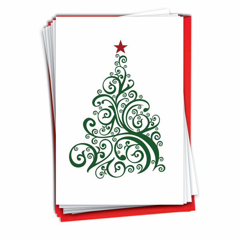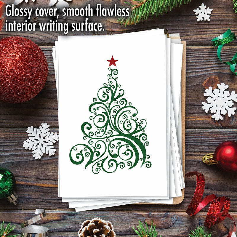 In this season of love and joy, let us not forget that simple gestures can go a long way in making someone smile, feel loved and remembered. A small thing such as writing a short message in a beautiful card can move someone to tears and bring a big smile on their faces. So, in this Yuletide season don't forget to share the spirit of love and appreciation to all your friends and family members. Our 12-piece card pack is the perfect companion for this noble endeavor. The front cover has a simple green tree drawn with thick green wavy lines to give it that artistic look and feel, a red start at the top completes this nice image which represents the holiday season perfectly. Go ahead and order this now. Our good as gold cards are printed on thick, snow white cardstock. All happy holiday notecards are made of recycled material (no papyrus, naturally). Our print on demand technology further reduces paper waste and environmental impact. The high gloss cover photo pops with quality and color, while the inside is matte, creating a smooth writing surface for your heartfelt, joyful Christmas notes. This Christmas season, reach friends, family, and coworkers living near or far, as every greeting card ships with a mailing envelope. Bulk notecard assortments and sets arrive in a reusable box. All boxed notecard sets are easily stored in a work office desk, ready to customize for your next life occasion. Some card designs and photos even look great framed, creating appealing wall art for your home. This year, leave a big impression on your recipient, no matter the occasion. There are beautiful designs, and funny greetings, waiting for you! Many family friendly options, including cute and adorable art for kids, adorn our greeting card covers.