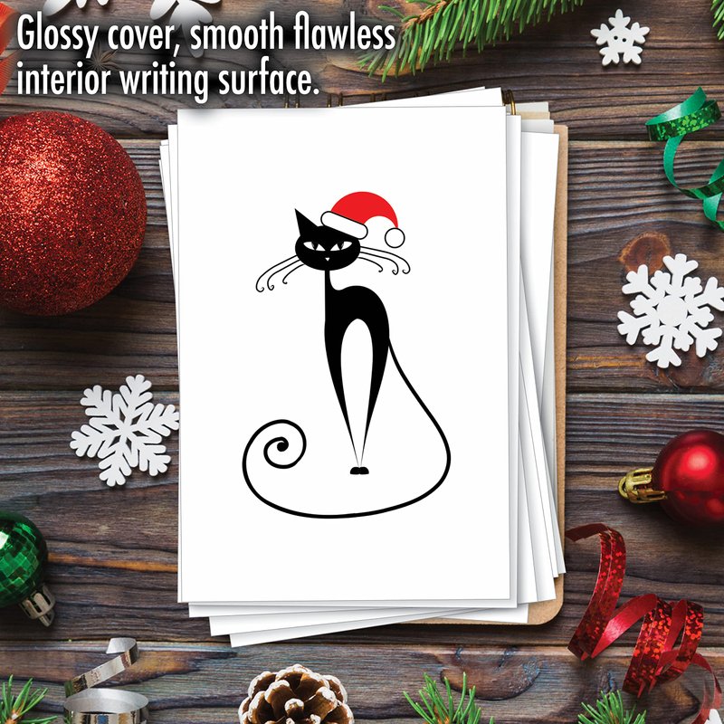 Have a purrfect time this Holiday season with this elegant hand drawn catty Christmas Card. A simple yet creative design suitable to both kids and adults alike, the stark white background giving more emphasis to the sleek black cat wearing a red and white Santa Hat, staring straight at your soul with those almond shaped eyes. Great for people who love cats or for you to share your love for these feline creatures to others, who doesn’t find cats adorable? This 12-piece card set is exactly what you need to send out multiple greetings to friends and family, write down your sassy meow meows and make them smile. Lets all have a wonderful time this year, go ahead and order this set now and spread the love. Our good as gold cards are printed on thick, snow white cardstock. All happy holiday notecards are made of recycled material (no papyrus, naturally). Our print on demand technology further reduces paper waste and environmental impact. The high gloss cover photo pops with quality and color, while the inside is matte, creating a smooth writing surface for your heartfelt, joyful Christmas notes. This Christmas season, reach friends, family, and coworkers living near or far, as every greeting card ships with a mailing envelope. Bulk notecard assortments and sets arrive in a reusable box. All boxed notecard sets are easily stored in a work office desk, ready to customize for your next life occasion. Some card designs and photos even look great framed, creating appealing wall art for your home. This year, leave a big impression on your recipient, no matter the occasion. There are beautiful designs, and funny greetings, waiting for you! Many family friendly options, including cute and adorable art for kids, adorn our greeting card covers.