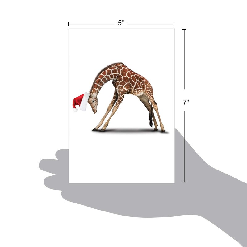 Happy white background with a Giraffe doing Yoga wearing a Santa hat, it doesn’t get more unique than that. Give your holiday greetings with this non-conventional designed xmas card that suggests a different approach to greeting cards, introducing earths tallest animal all stretched out in his magnificent splendor. A great card for people that love wild animals. Kids of all ages will appreciate this simple yet prominent image at the front. No background noise to draw the attention away from this magnificent creature. This 12-piece card set is great for sending out greetings to multiple individuals without worrying about whether they will like to design or not. No one can resist this funny yet beautiful animal. Our good as gold cards are printed on thick, snow white cardstock. All happy holiday notecards are made of recycled material (no papyrus, naturally). Our print on demand technology further reduces paper waste and environmental impact. The high gloss cover photo pops with quality and color, while the inside is matte, creating a smooth writing surface for your heartfelt, joyful Christmas notes. This Christmas season, reach friends, family, and coworkers living near or far, as every greeting card ships with a mailing envelope. Bulk notecard assortments and sets arrive in a reusable box. All boxed notecard sets are easily stored in a work office desk, ready to customize for your next life occasion. Some card designs and photos even look great framed, creating appealing wall art for your home. This year, leave a big impression on your recipient, no matter the occasion. There are beautiful designs, and funny greetings, waiting for you! Many family friendly options, including cute and adorable art for kids, adorn our greeting card covers.