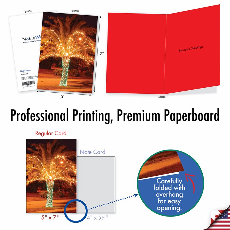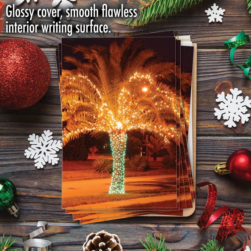 Light up someone's Holiday season with this bright and beautiful Christmas Greeting card. As an alternative to those lush green pine trees, in the warmer area’s we have decorated the Palm trees wrapping them in bright lights for that festive mood. Send your warm greeting from the sunny palm areas with this 12-piece card set, containing an ample supply for all your holiday needs. Share those sunny weather cheers with friends and family by writing down your earnest X-mas greetings giving them that whole-hearted fuzzy feeling of happiness. Our wonderful cheerful design is suitable for any type of individual whether young or old. So, go ahead order this card now and spread love and joy to each and everyone. Our good as gold cards are printed on thick, snow white cardstock. All happy holiday notecards are made of recycled material (no papyrus, naturally). Our print on demand technology further reduces paper waste and environmental impact. The high gloss cover photo pops with quality and color, while the inside is matte, creating a smooth writing surface for your heartfelt, joyful Christmas notes. This Christmas season, reach friends, family, and coworkers living near or far, as every greeting card ships with a mailing envelope. Bulk notecard assortments and sets arrive in a reusable box. All boxed notecard sets are easily stored in a work office desk, ready to customize for your next life occasion. Some card designs and photos even look great framed, creating appealing wall art for your home. This year, leave a big impression on your recipient, no matter the occasion. There are beautiful designs, and funny greetings, waiting for you! Many family friendly options, including cute and adorable art for kids, adorn our greeting card covers.