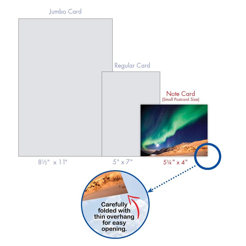 We offer a huge 8.5 x 11-inch jumbo size version of most of our designs and assortment packs of our most popular designs in just about any occasion and configuration. We also publish blank versions of many designs and assortments to be used as thank you notes, friendship, miss you, thinking of you or any other purpose or occasion you can think of.