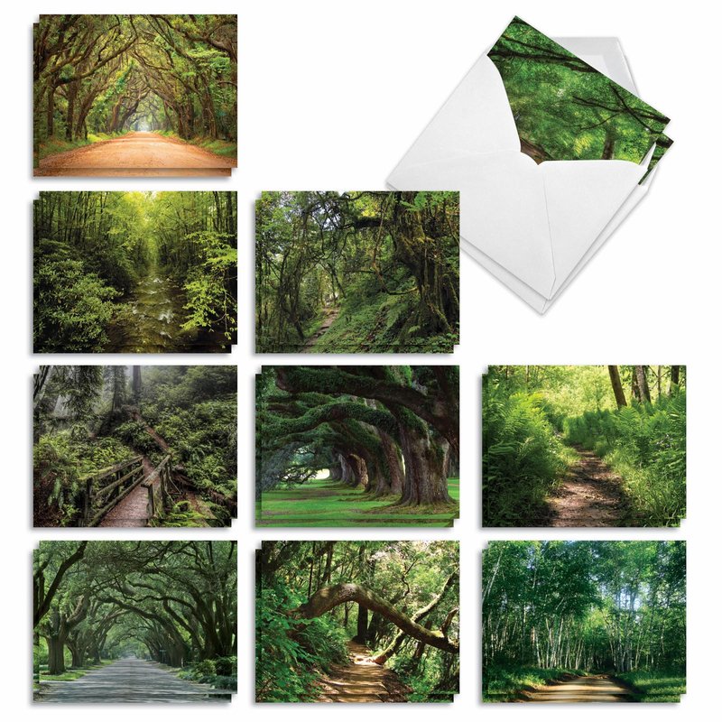 - INSIDE GREETING: The inside is ungreeted, making this perfect for your customized thinking of you, miss you, just because notes, for any time and for all occasions! COVER - [Featuring Meandering Paths and Trails Through Lush Forests and Overhanging Trees]
