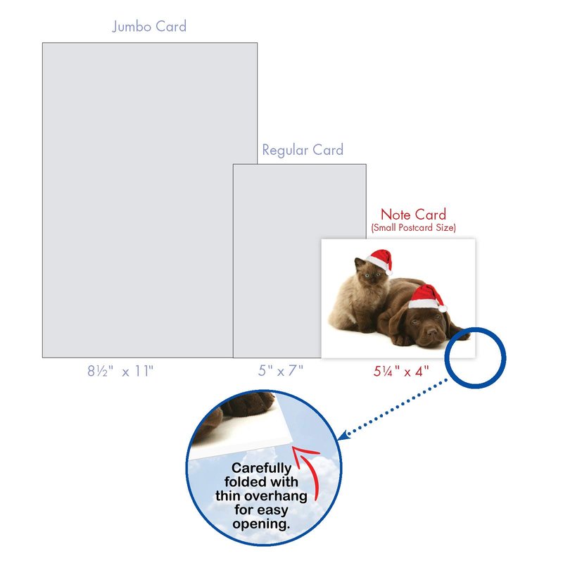 We offer a huge 8.5 x 11-inch jumbo size version of most of our designs and assortment packs of our most popular designs in just about any occasion and configuration. We also publish blank versions of many designs and assortments to be used as thank you notes, friendship, miss you, thinking of you or any other purpose or occasion you can think of.