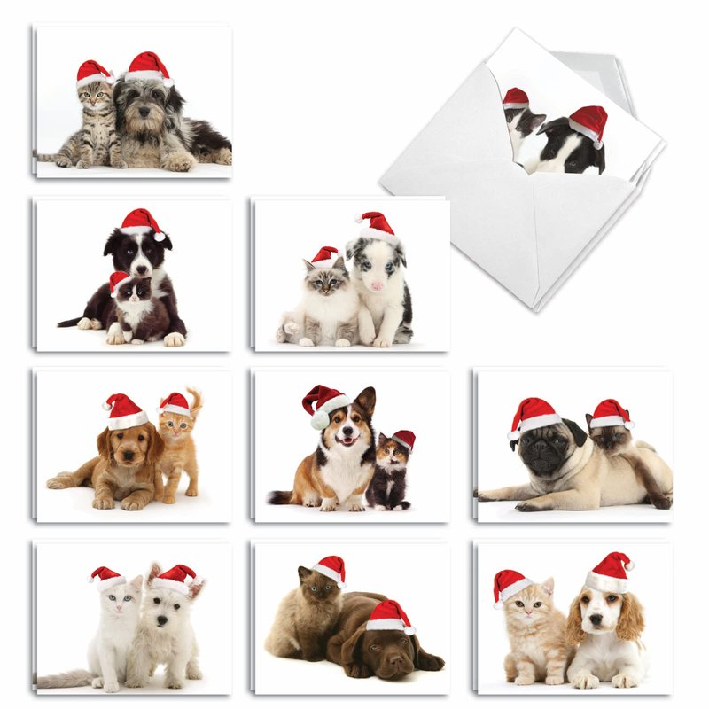 - INSIDE GREETING: The inside is ungreeted, making this perfect for your customized notes for all occasions! COVER - [kittens and puppies sitting with santa hats]