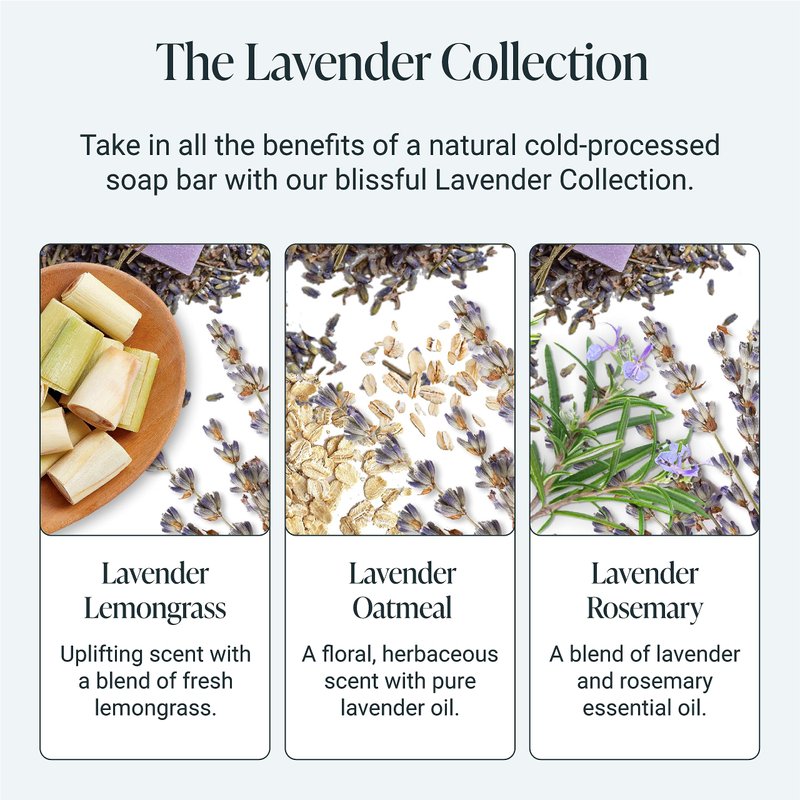 - LAVENDER COLLECTION SCENTED SOAP BAR: Features all 3 of our lavender scented soap bars - lavender with invigorating lemongrass, exfoliating oatmeal, and earthy rosemary essential oil. A cleansing experience that refreshes both body and soul. Crafted with raw shea butter, they creates a rich, frothy lather, leaving your skin feeling pampered and soft