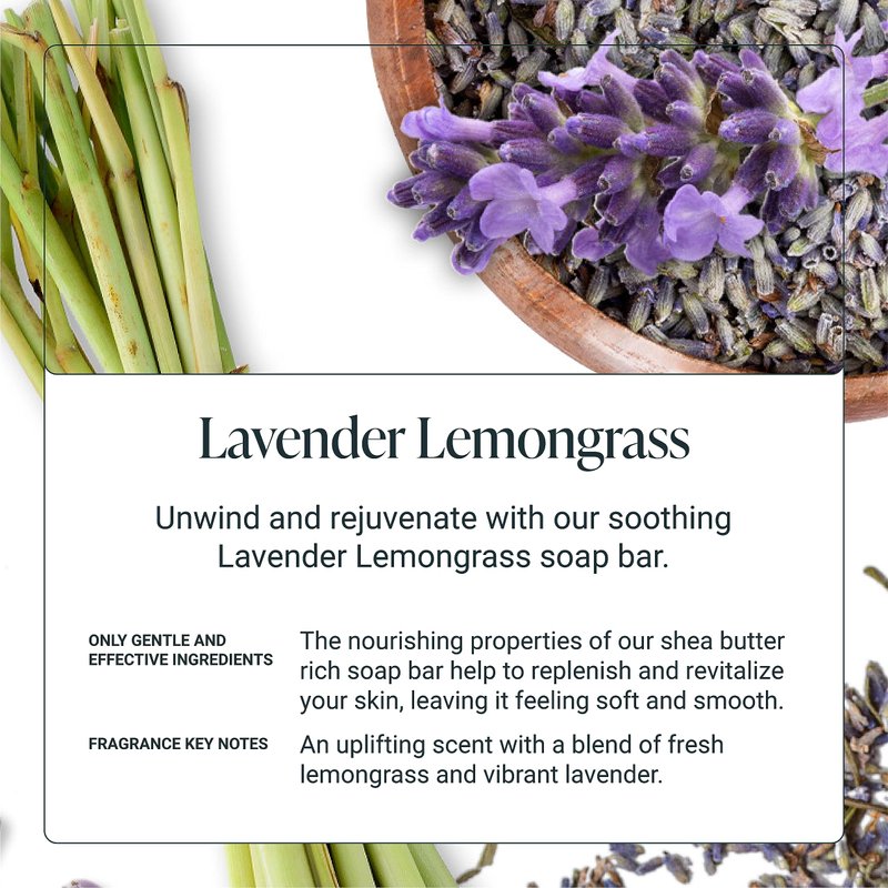 - LAVENDER LEMONGRASS SCENTED BAR SOAP: This combination of Lavender and Lemongrass creates an uplifting and happy scent, that is fresh, crisp, and vibrant. The Raw shea butter in the soap creates a creamy and frothy conditioning lather.