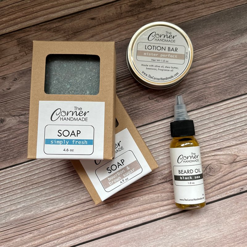 The Corner Handmade Beard Oil Gift Box, Mens Grooming Gift Set, Holiday Gift Basket, Body Care Gift for Dad