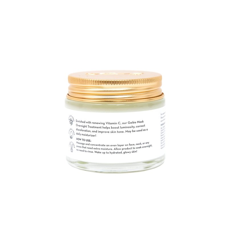 Vitamin C Gelée Mask Overnight Treatments A gelée mask overnight treatment fortified with renewing vitamin C to help boost luminosity, correct discoloration, and improve skin tone. Made in Korea 2.36oz/70g Not Tested on Animals