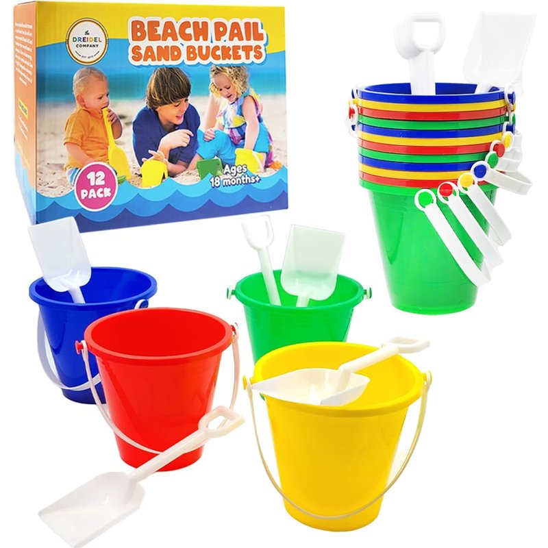 The Dreidel Company Beach Day Playsets (Pack of 12) 5.25" Sand Bucket Play Set Box Includes, Pail & Shovel Sand Toy for Boys and Girls Birthday Party Favor