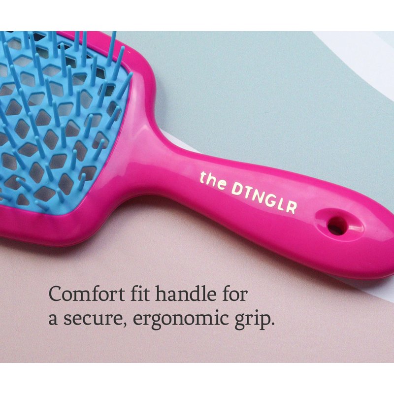 Introducing your next detangling brush, a solution to revolutionize your hair care routine – the DTNGLR untangle hair brush. Step into a new era of effortless, pain-free hair maintenance with a vented detangling brush designed for your unique hair needs. Tailored to make detangling wet or dry hair a breeze, the DTNGLR wet and dry detangling hair brush is a game-changer for all hair types and textures. Whether you prefer to brush your hair while it's wet in the shower or during your daily styling, the DTNGLR detangling hair brush seamlessly fits into your everyday routine. Its water-friendly hollow-back vented design allows for efficient detangling both on wet and dry hair. Our innovative design provides just the right amount of gentle pressure to swiftly and painlessly detangle your hair. No more tugging, tearing, or discomfort – just a smooth glide through your strands, leaving your hair beautifully knot-free. Designed with your comfort in mind, the DTNGLR detangling brush features a comfort-fit handle that ensures a secure and ergonomic grip. Experience the pleasure of a wet and dry brush that pampers your hair comfortably, making it a breeze to unbrush your curls and detangle your locks.
