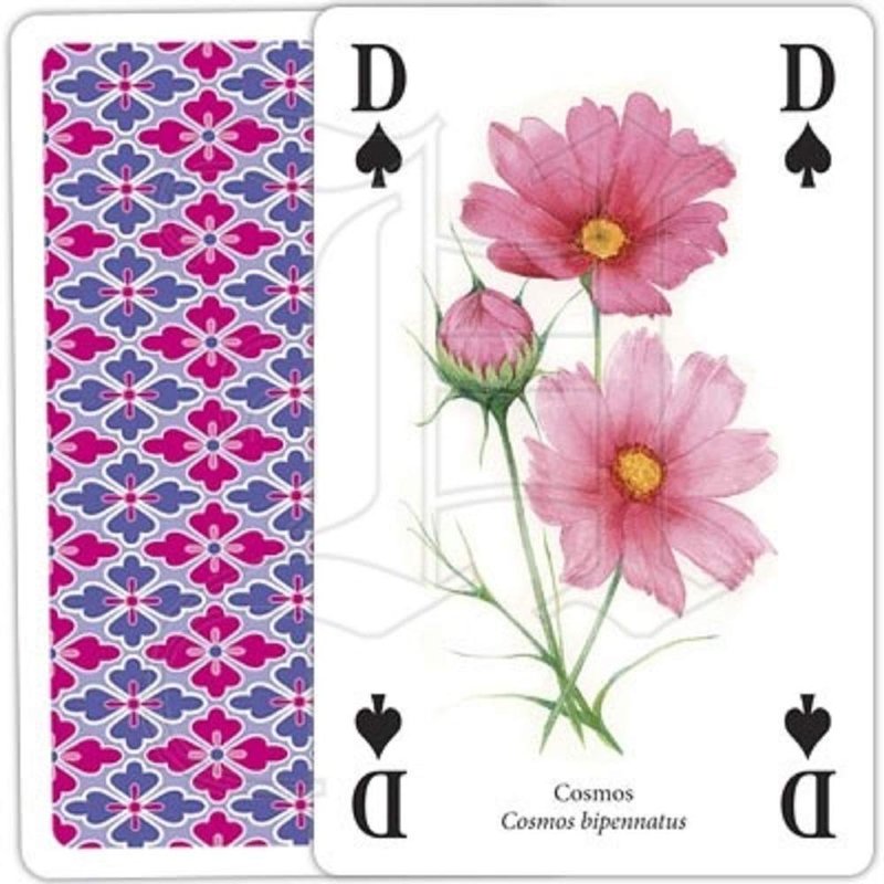 This is a collectable package of 54 playing cards, including 2 jokers. Play all your favorite card games with this beautifully illustrated, full-color deck of cards which depicts an enchanting selection of favorite cottage flowers. Learn to identify the plants that are included in this high quality deck of cards. All cards are labeled with both the common and Latin names for over 54 frequently encountered garden flowers. Some examples include Lavender, Sweet William, Marigold, Poppy, Phlox, Foxglove, Peony, Hollyhock and Narcissus. Cards measure 2,25 inch by 3.5 inch and are constructed of quality stock which is plastic coated for durability.