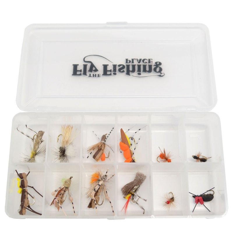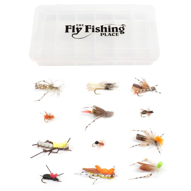 The Fly Fishing Place Trout Fly Assortment - Essential Terrestrials Fly Fishing Flies Collection - Includes Foam Hoppers, Ants, Beetles, and Cicadas - 1 Dozen Trout Flies with Fly Box
