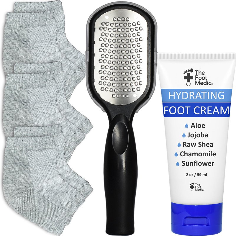 - 3 POWERFUL TOOLS: Package includes 3 pairs of Foot Medic moisturizing heel socks, 2 oz foot cream and one stainless steel foot file. This powerful kit is sure to get your heels back to the best they have been with regular usage. Cracked heel repair is only one cracked heel repair kit away.
