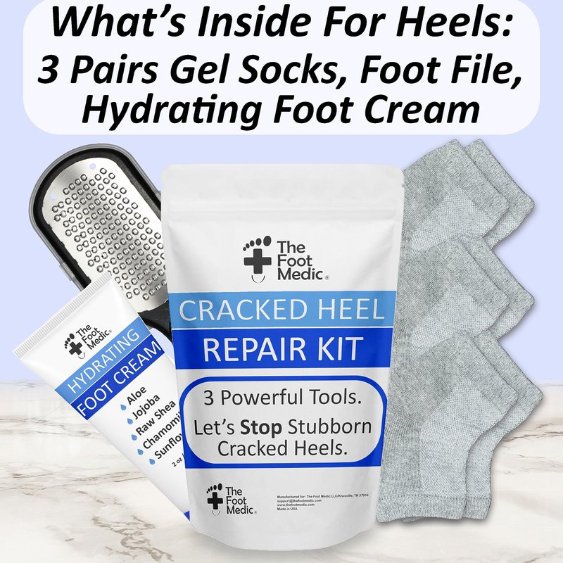 CRACKED HEEL REPAIR KIT- 6 POWERFUL SOCKS, FOOT CREAM & FOOT FILE: Package includes 3 pairs of Foot Medic moisturizing heel socks, one hydrating foot cream & one foot file for a low, affordable price. The Foot Medic Foot Cream, includes 2 oz's of premium moisturizing foot cream made in the usa. The stainless steel foot file is durable and easy to use. These powerful gel lined socks, foot cream and the foot file are sure to get your heels back to the best they have been with regular usage. Cracked heel repair is only one kit away.