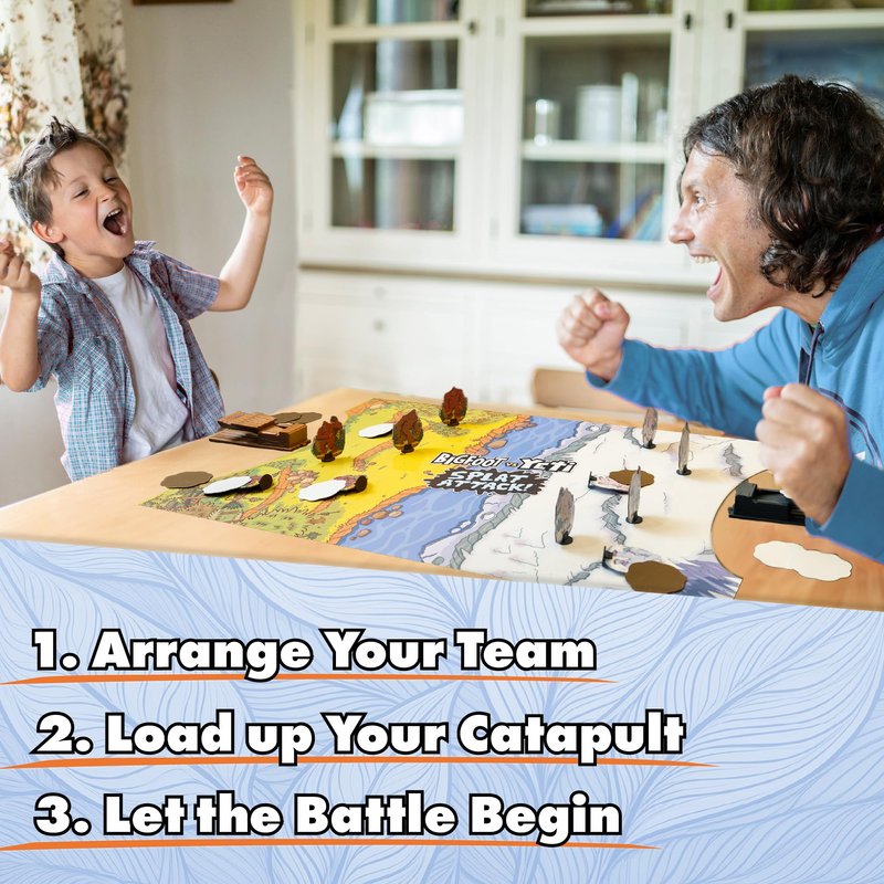- Game Components: Includes 6 Bigfoots, 6 Yetis, 10 splat patties, 2 catapults, and 1 game board. Everything you need for a silly showdown! For 2 players ages 6+