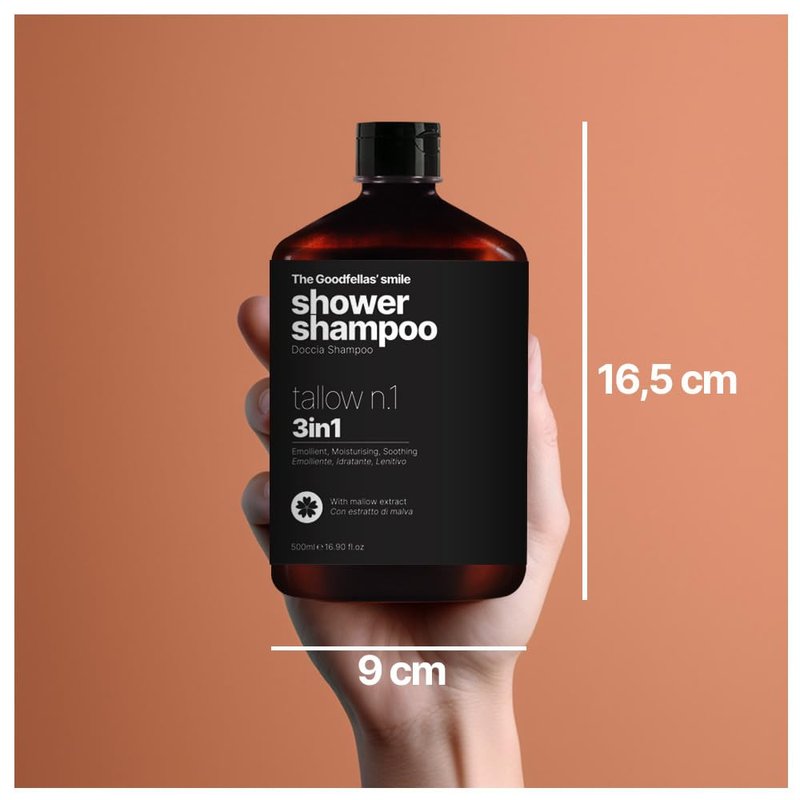 The Goodfellas'smile Shower Shampoo Tallow n.1 500ml Tallow n.1 is a warm and flowery fragrance like a walk through flowery meadows in late spring. Olfactory pyramid: Top notes: Ylang, Green, Cassis, Fig Heart notes: Rose, Heliotrope, Jasmine, Orange Blossom Base notes: Cedar Wood, Amber, Musk The Goodfellas' smile Shower Shampoos are nourishing and soothing based on mallow extract. It acts both as a shampoo and shower gel, soothing and cleansing the skin. The Tallow n.1 shower shampoo makes hair soft and shiny while the Mallow extract hydrates dry skin. Its controlled foaming makes it an ideal product in every situation. How to use: Apply a small amount of product to skin and hair. Massage with circular movements and rinse. Use 2-3 times a week. Warnings: Do not ingest, keep out of reach of children, avoid contact with eyes and mucous membranes.