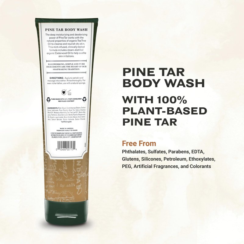 - PROUDLY CERTIFIED Our Pine Tar Body Wash is made with Certified Organic Tea Tree Leaf Oil and Cedar Wood Oil. Clinically tested safe for sensitive skin. Tube is made with 52% Post Consumer Recycled Content. Family Owned and Operated and Made in the USA.