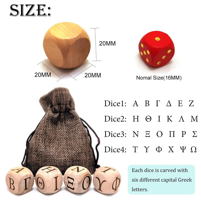 - DICE SIZE:20MM(0.787IN)X20MM(0.787IN)X20MM(0.787IN).Compared with dice of normal size (16MM), dice of this size are more suitable for teaching and display; Each dice set includes 4 wooden dice with 24 carved Capital Greek alphabet letters.