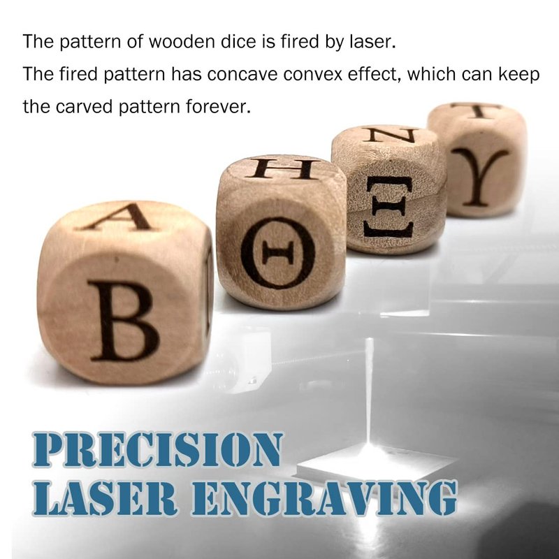 - MATERIAL & PROCESS: Made of sturdy , solid Pine Natural wood,hand sanded edges and corners prevent dice from chipping or splitting. It uses a precise laser carving machine to carve. After laser firing, the pattern will be embedded in the wooden dice. It has a three-dimensional and concave convex feel. Unlike the printed pattern, it will never fall off.