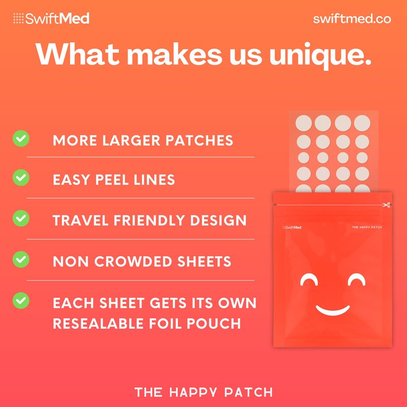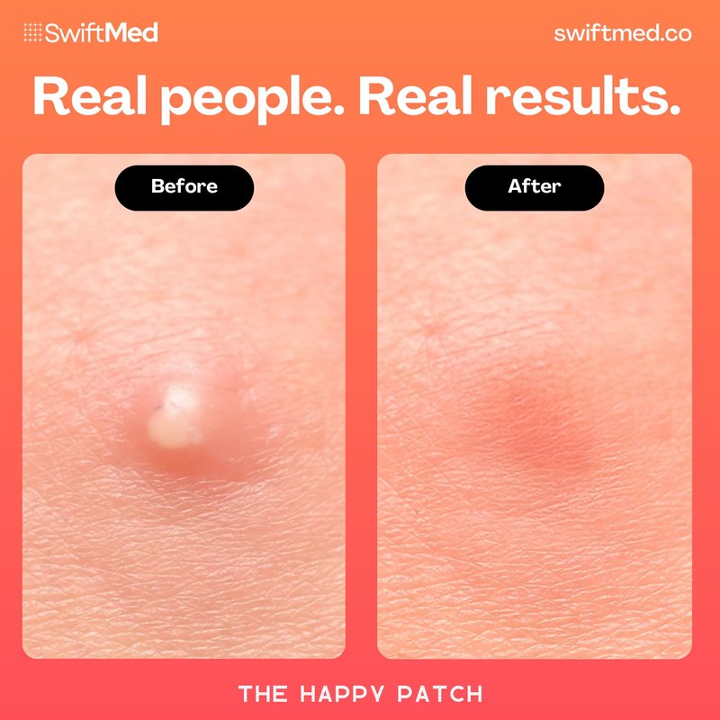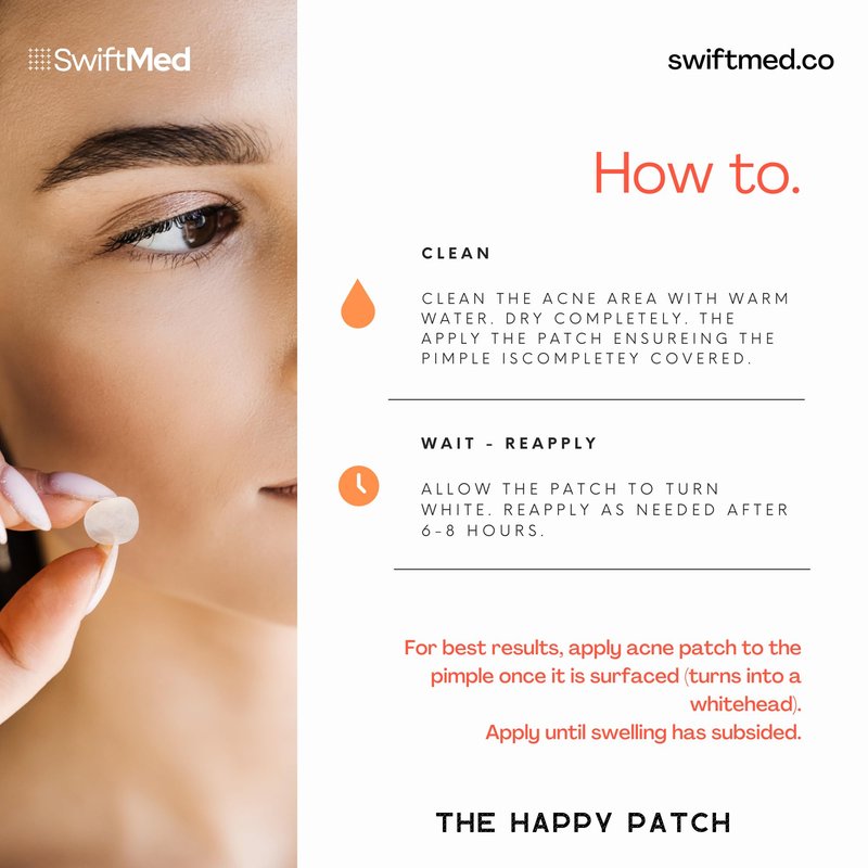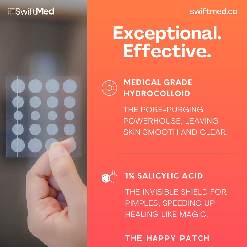 - ⚡ Rapid Relief with The Happy Patch: SwiftMed offers a quick fix for sudden pimples with The Happy Patch. These patches contain acne-fighting ingredients like Salicylic Acid and Hydrocolloid. They are great for whiteheads, soaking up excess oil and making pimples smaller fast. Just apply to clean, dry skin and let The Happy Patch do its job.